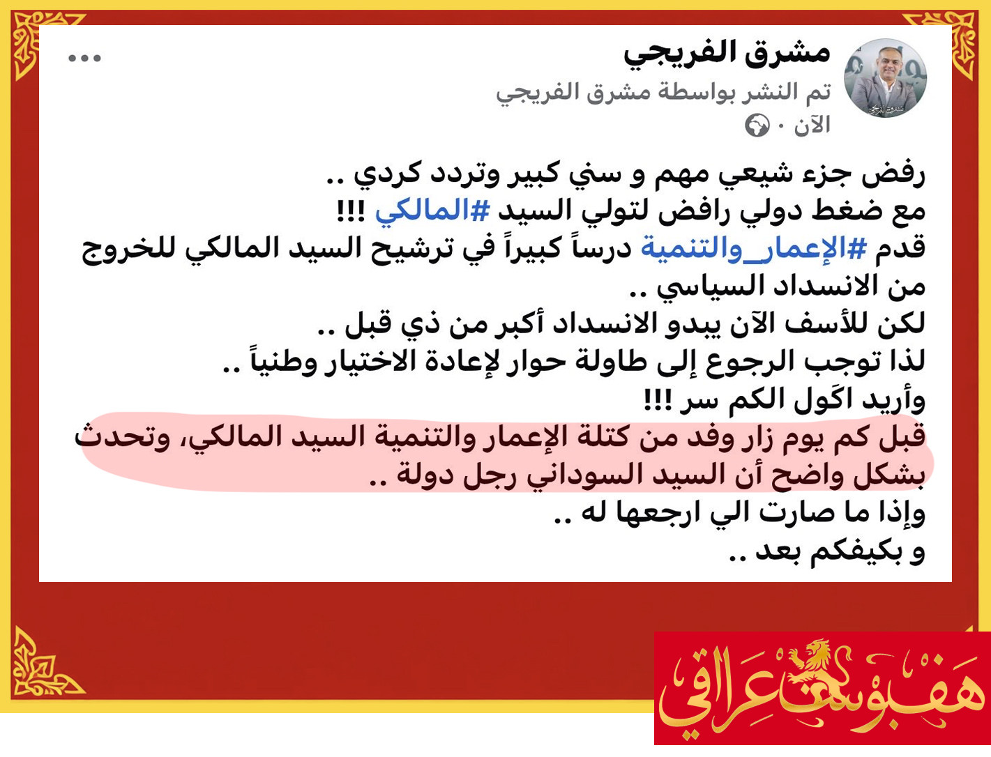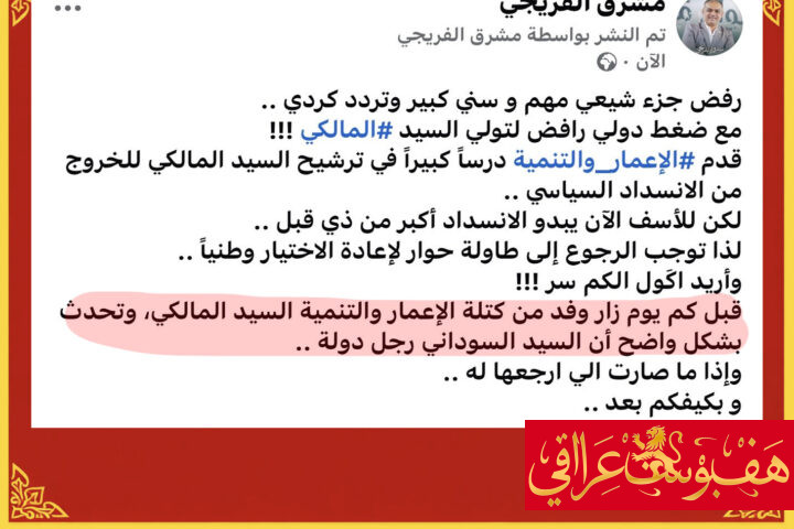 الفريجي ينقل عن المالكي: “السوداني رجل دولة .. وإذا ما صارت الي ارجعها له” فبراير 21, 2026 فبراير 21, 2026 هف بوست عراقي (hpi)(الحقيقة بلا فلتر 🔥): (ادرجنا اسمكم في القائمة الارسالية، لأهميته، تقبّل منا ذلك وحريصون على التواصل معك...Continue reading→