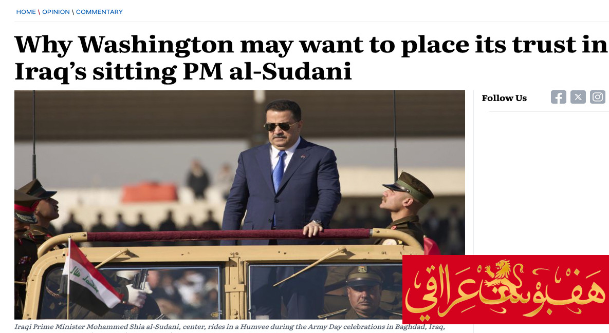 واشنطن تايمز: ثقة أمريكية متصاعدة بالسوداني بعد نجاحه في تحييد العراق عن الحروب أبريل 14, 2026 أبريل 14, 2026 هف بوست عراقي (hpi)(الحقيقة بلا فلتر 🔥): (ادرجنا اسمكم في القائمة الارسالية، لأهميته، تقبّل منا ذلك وحريصون على التواصل معك...Continue reading→